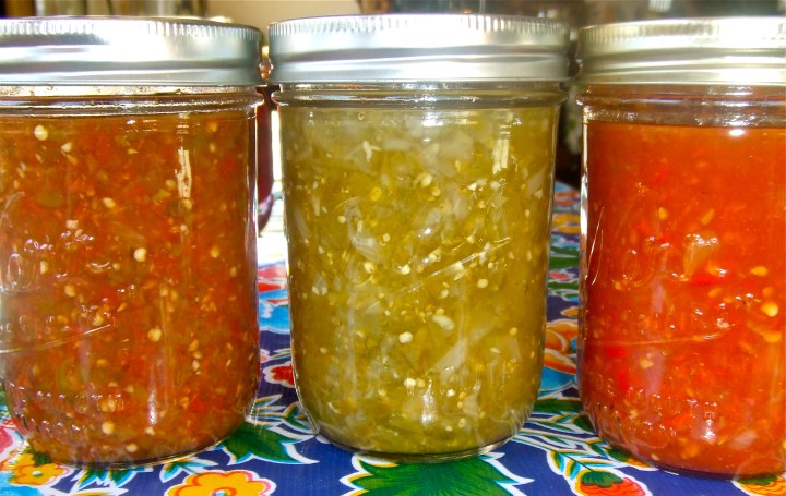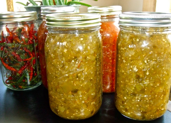 Salsa verde with it’s red tomato sisters and dried cayenne peppers.