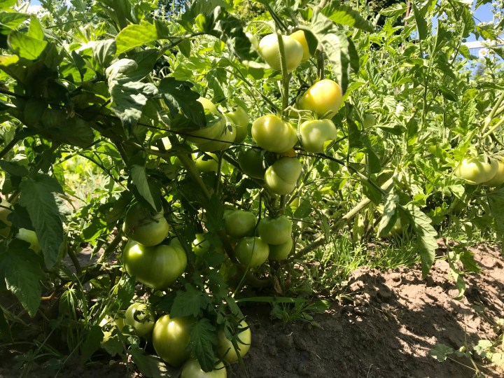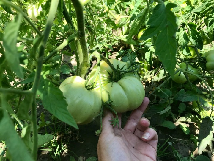 There’s over six feet between my chair at the table and visitors under the cherry tree. And the fresh food inspires us, talking about pickling, drying and canning, growing and cooking what we love. My favorite foodie conversation this week came from a woman looking for a flat of green tomatoes—to make her green tomato pie. Just hearing her recipe, how no one wants to try it, but everyone loves it, zests up the day, and I think I’ll be making green tomato pie before harvest is through.
