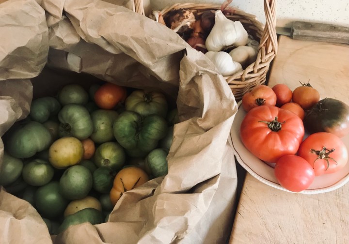 Big brown paper bags of green tomatoes ripen nicely in a the cool, closed up pantry.