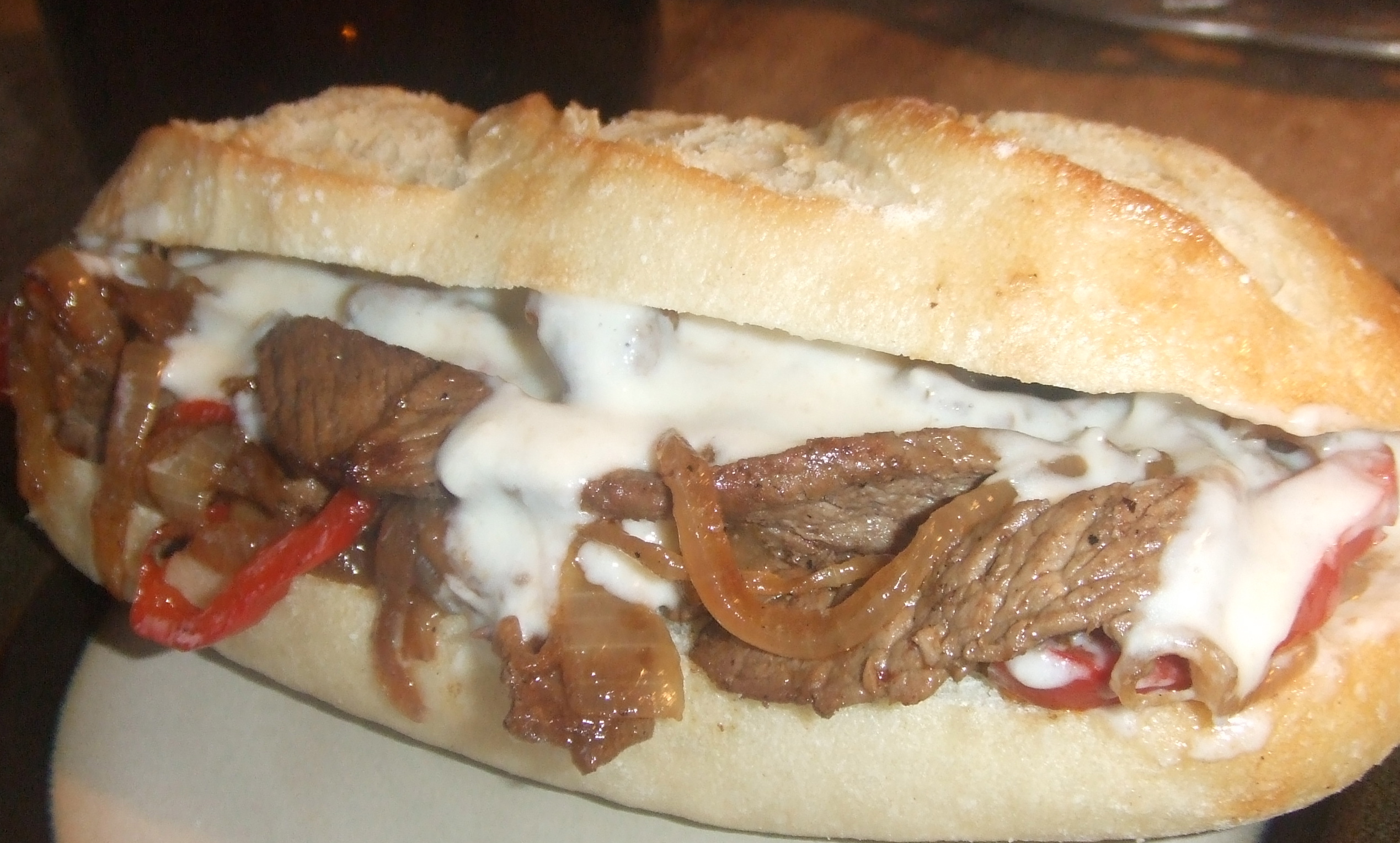 ~Lightly toast bread or rolls; to construct the cheesesteak, top 1/2 roll with onions, peppers and beef, then drizzle the cheese sauce over all; serve with roll top, and be sure to have clean up access, because this is definitely a 2 napkin sandwich.