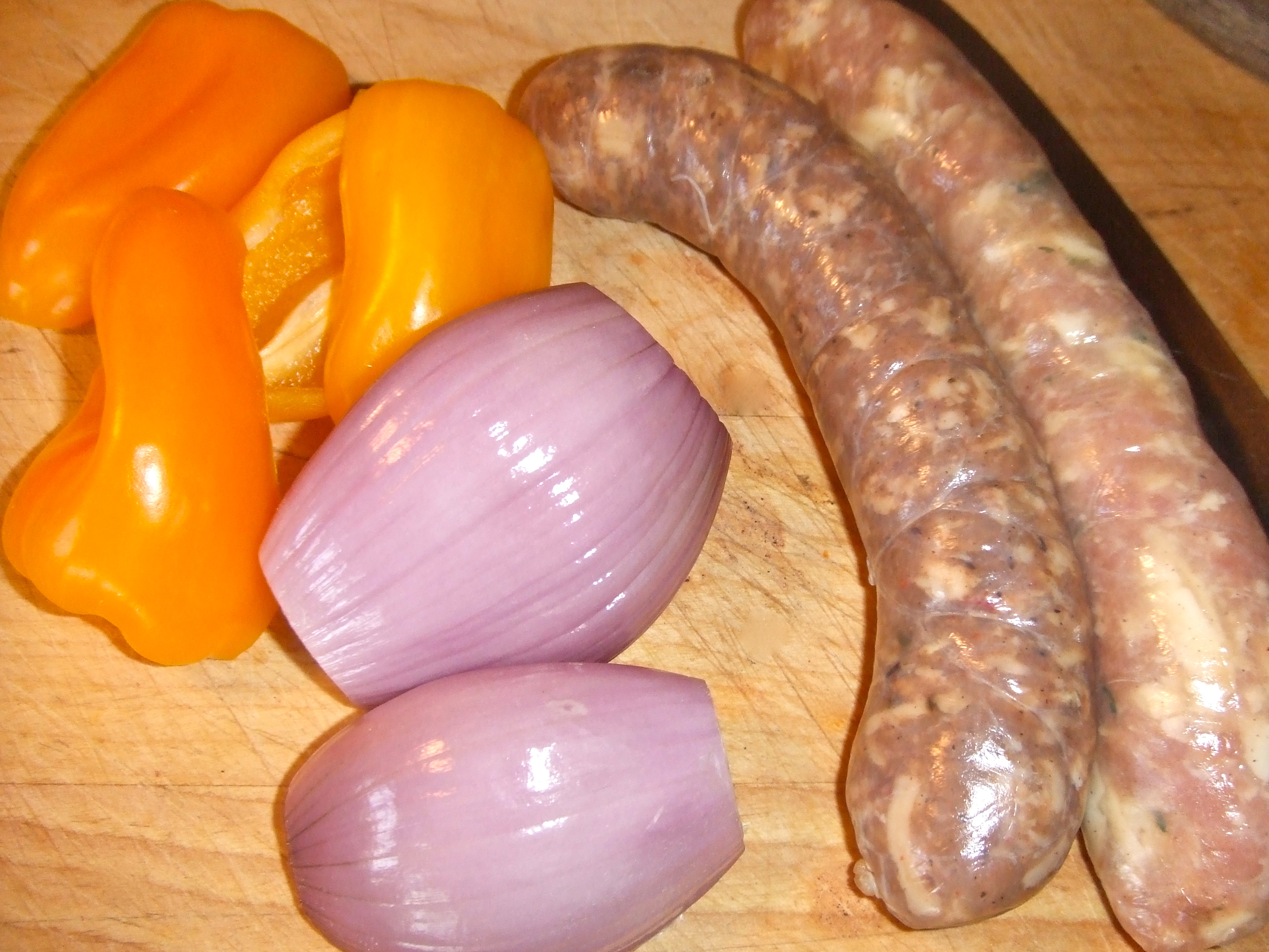 Aside from the locally made sausage, this recipe is gratifyingly sustainable because almost every single ingredient is something we can produce. Eggs are farm fresh from the beloved chickens. Peppers grow in the garden as do herbs. Shallots are preferable, but onions will do the trick.