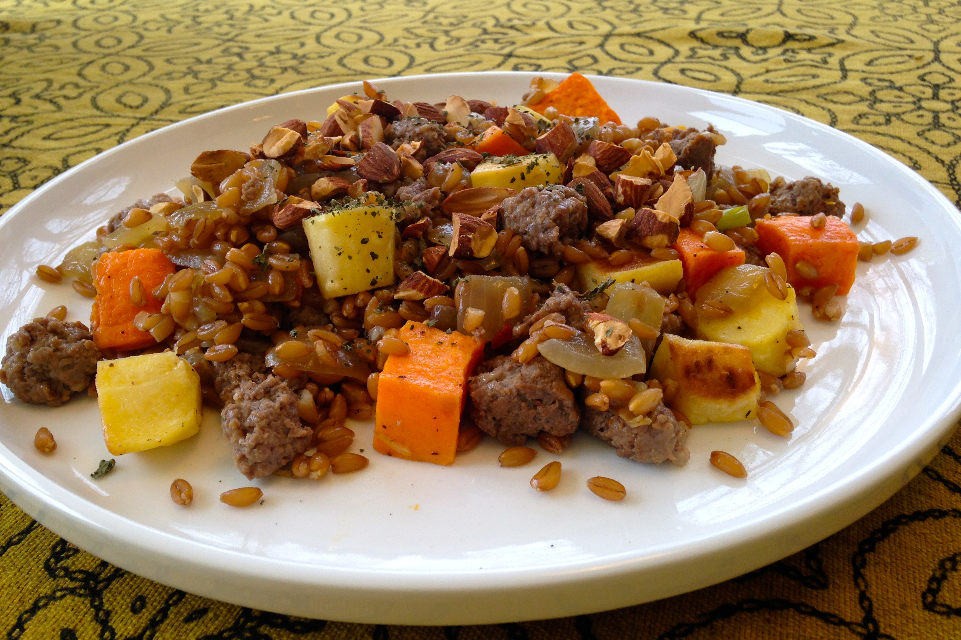 Hot Farro with Elk Sausage and Root Vegetables Recipe